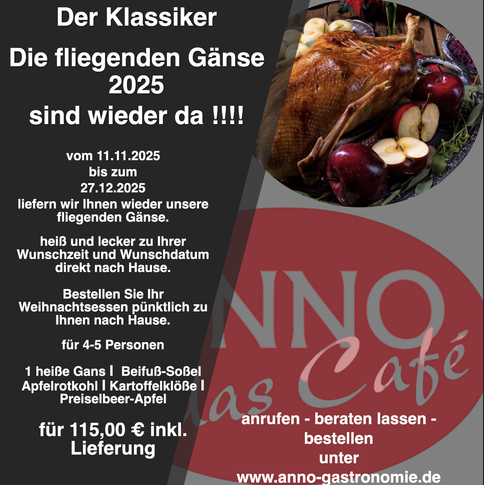 Wir liefern Ihnen die heiße Gans mit Rotkohl, Kartoffelklößen, Bratapfel, Preiselbeeren und unserer Beifuß-Soße direkt zu Ihnen nach Hause. Bestellen Sie zu Ihrer Wunschzeit die heiße Gans nach Hause.